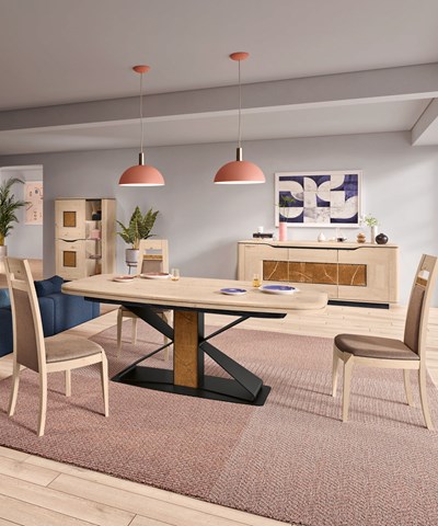 Avec nos programmes de salles à manger, vous donnez à votre pièce la cohérence d’un ensemble structuré. Une collection complète, c’est aussi du choix. Dans nos ensembles, vous choisissez entre plusieurs buffets, différentes tables et meubles tv. Nous proposons des styles variés et de nombreuses possibilités pour une liberté totale de personnalisation.