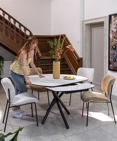 En quelques secondes, votre table peut accueillir vos proches. Convivialité assurée ! Les allonges font parties de la table. Qu’elles se placent en bout de table ou au milieu de plateau, plus besoin de les conserver à la cave ou au grenier… pratique non ?